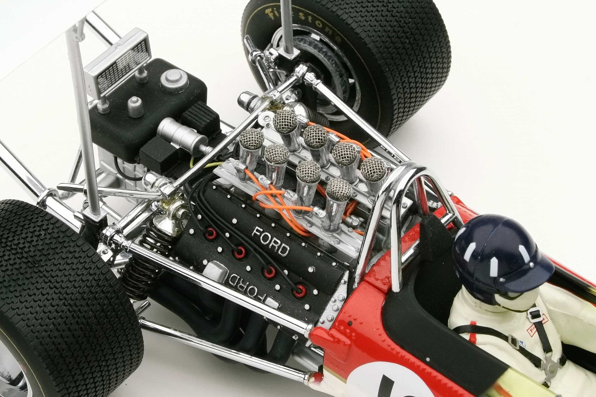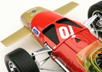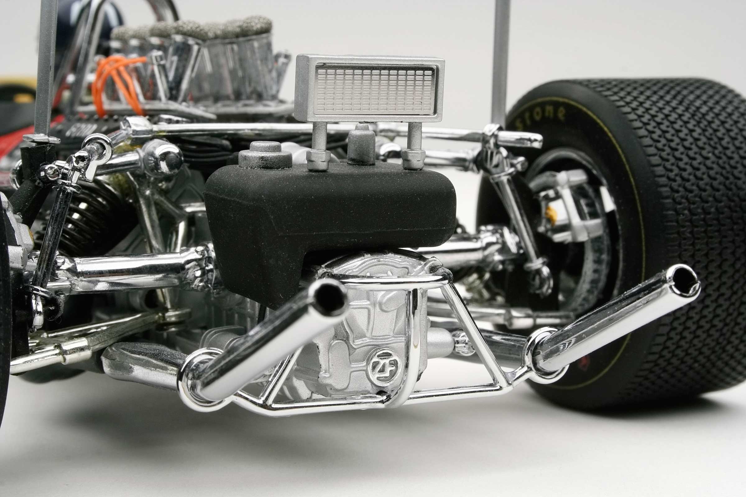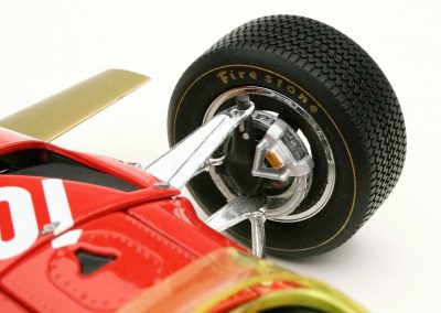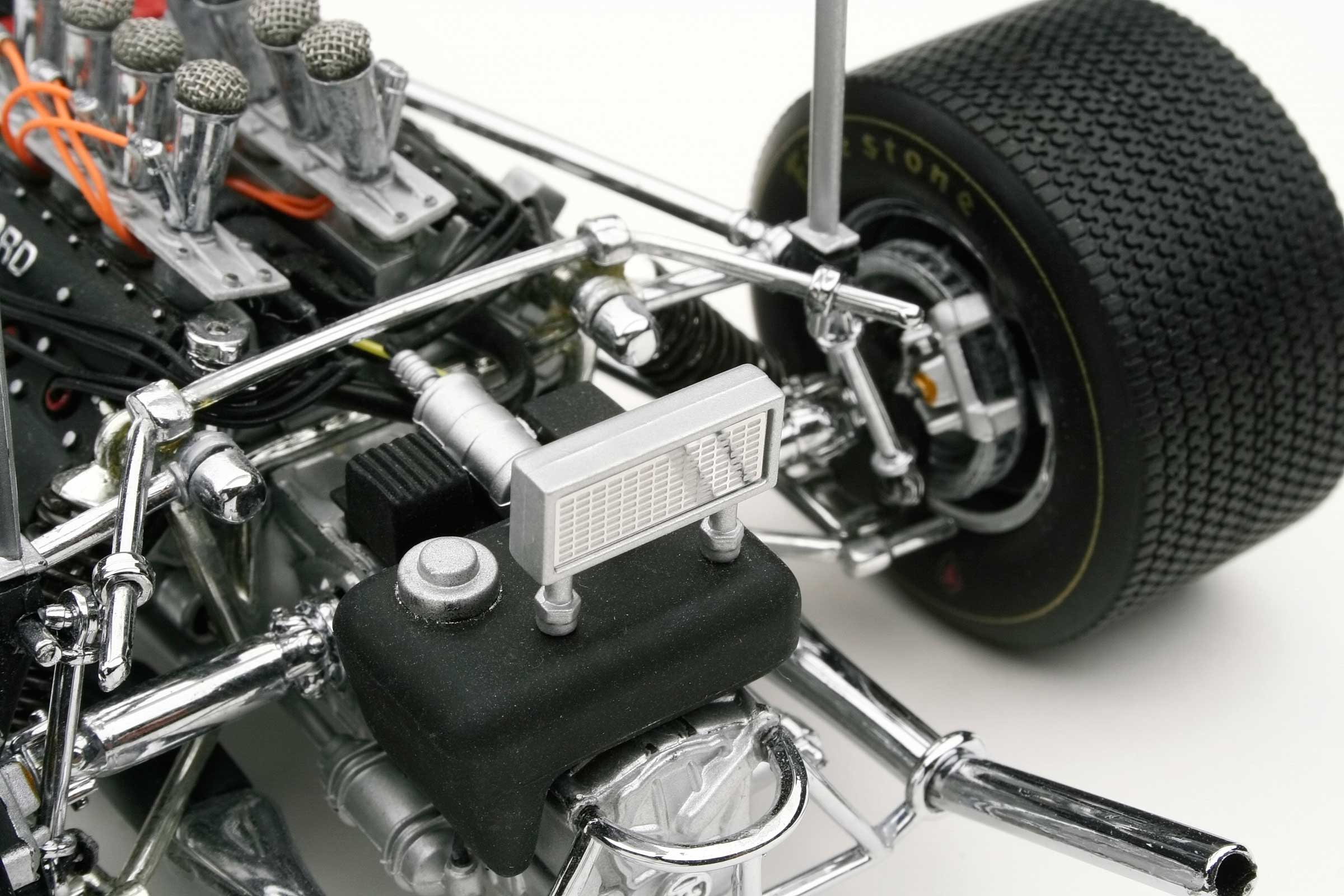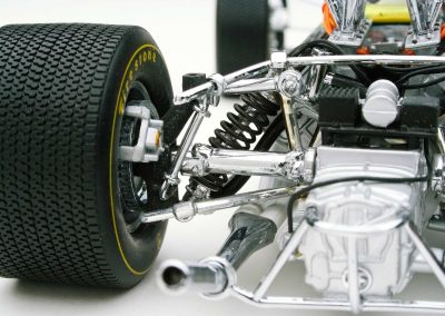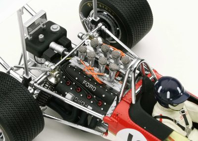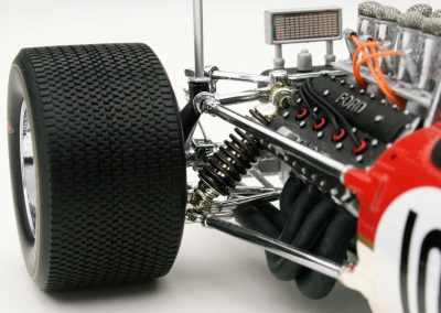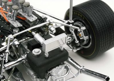 These incredible replicas feature over 130 individual parts with details that include fully functioning steering, working front and rear suspension, highly detailed driver and cockpit, genuine tread pattern on rubber-like tires, accurate wiring and plumbing, actual wire mesh gauze over the velocity stacks, individual cast exhaust headers and many photo-etched parts.