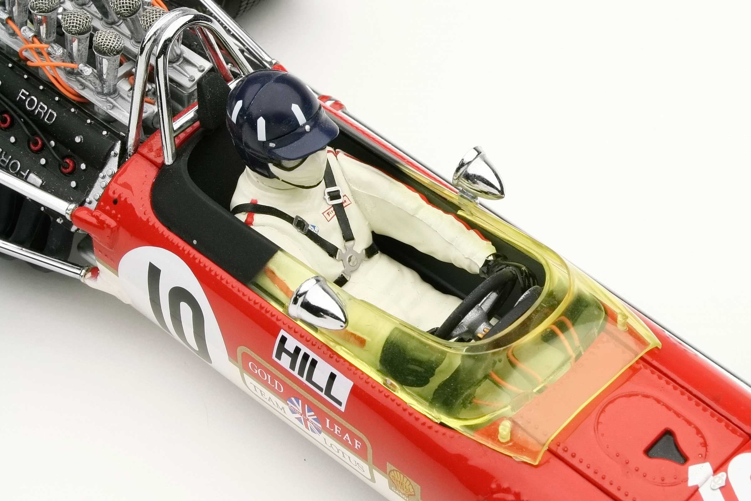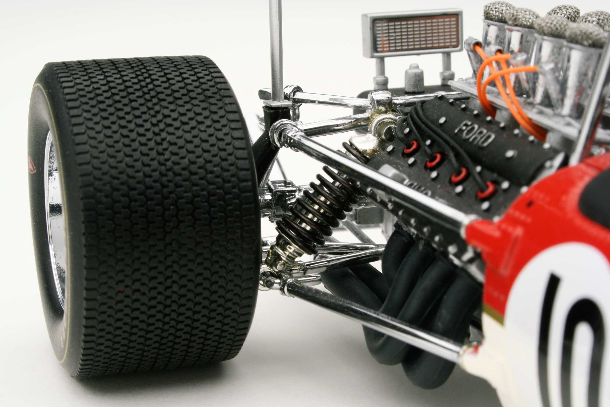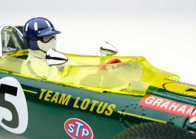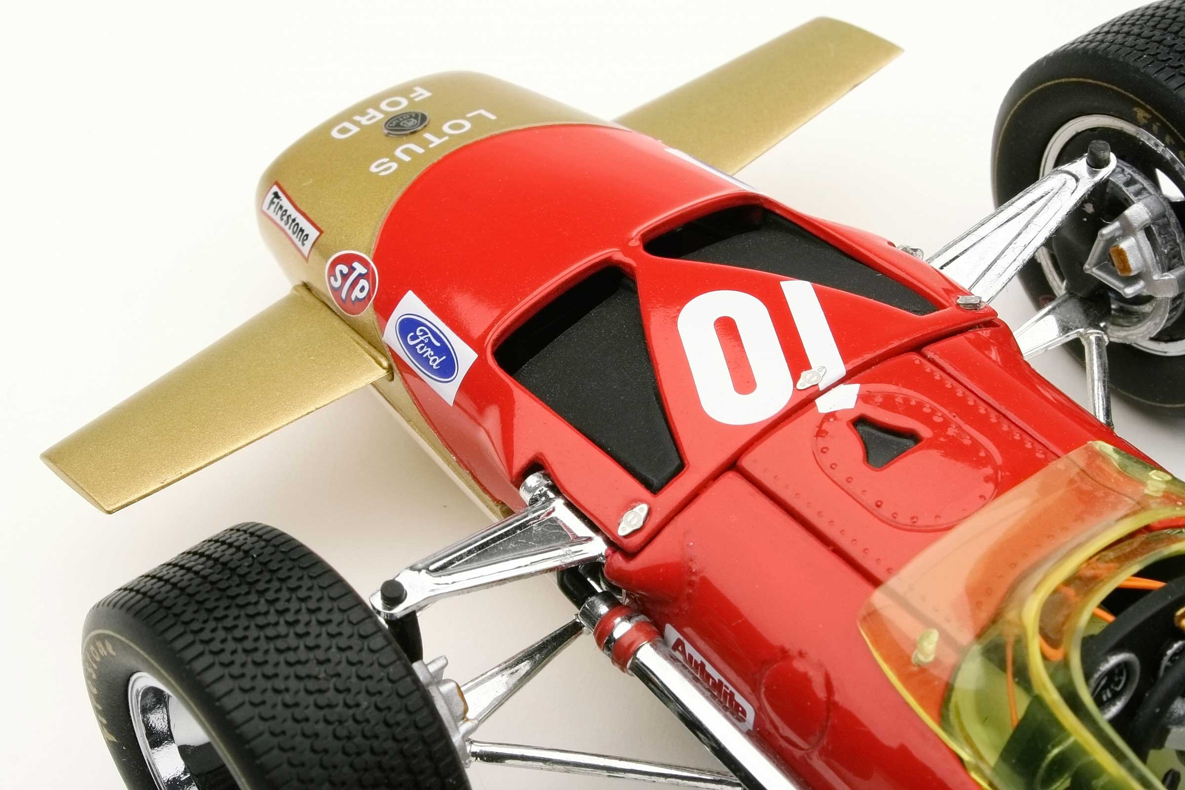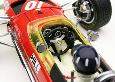 These incredible replicas feature over 130 individual parts with details that include fully functioning steering, working front and rear suspension, highly detailed driver and cockpit, genuine tread pattern on rubber-like tires, accurate wiring and plumbing, actual wire mesh gauze over the velocity stacks, individual cast exhaust headers and many photo-etched parts.