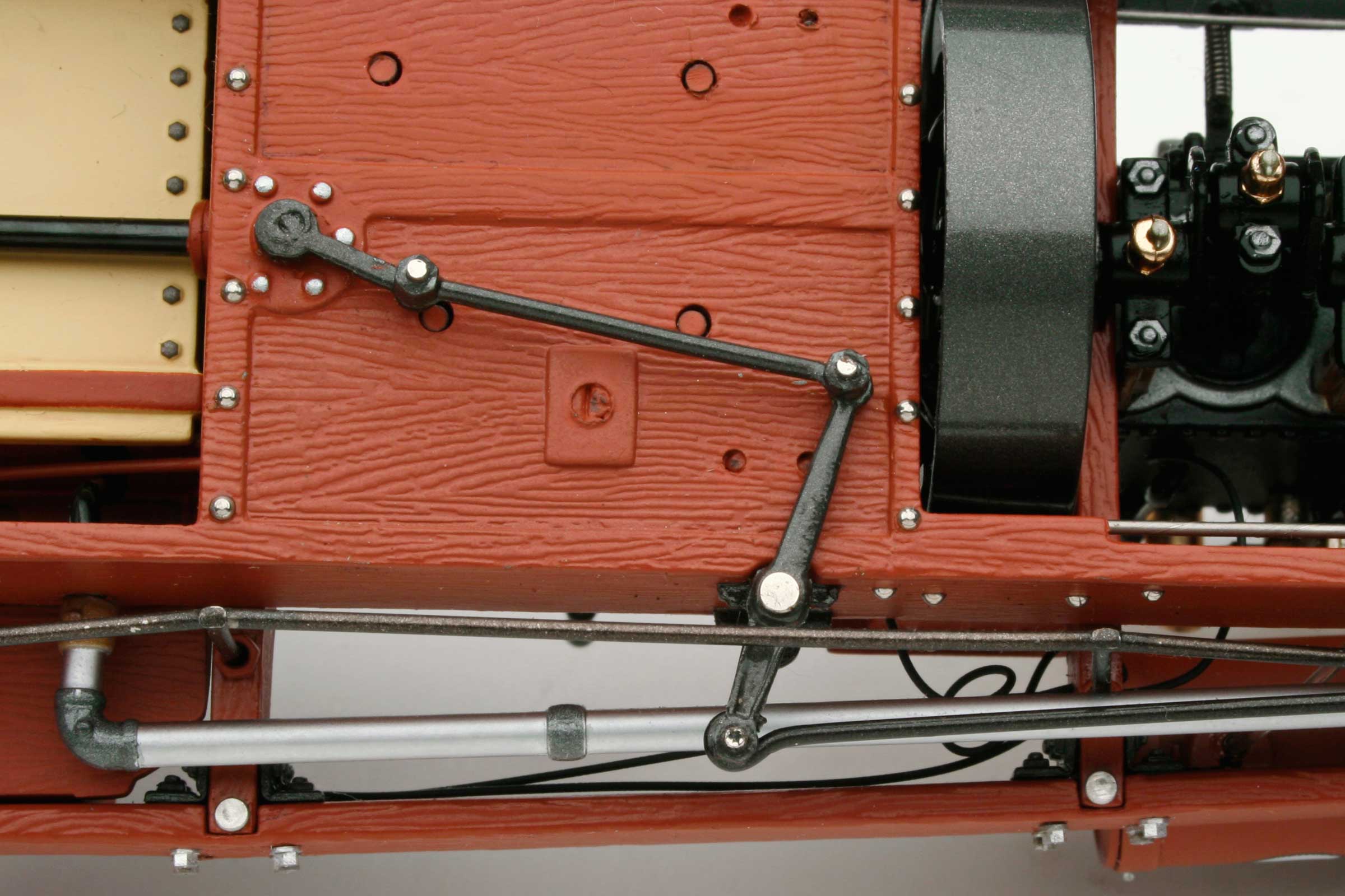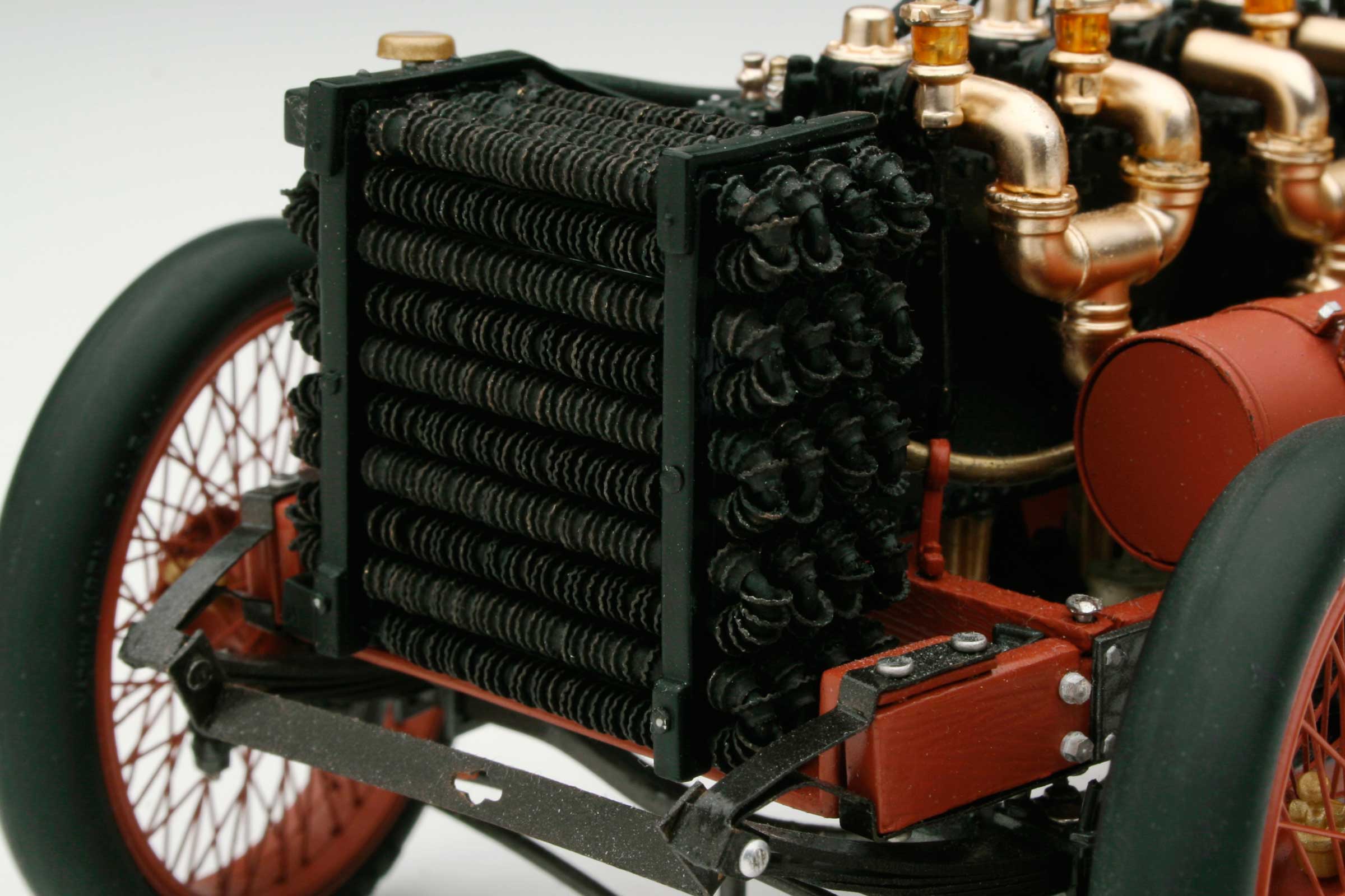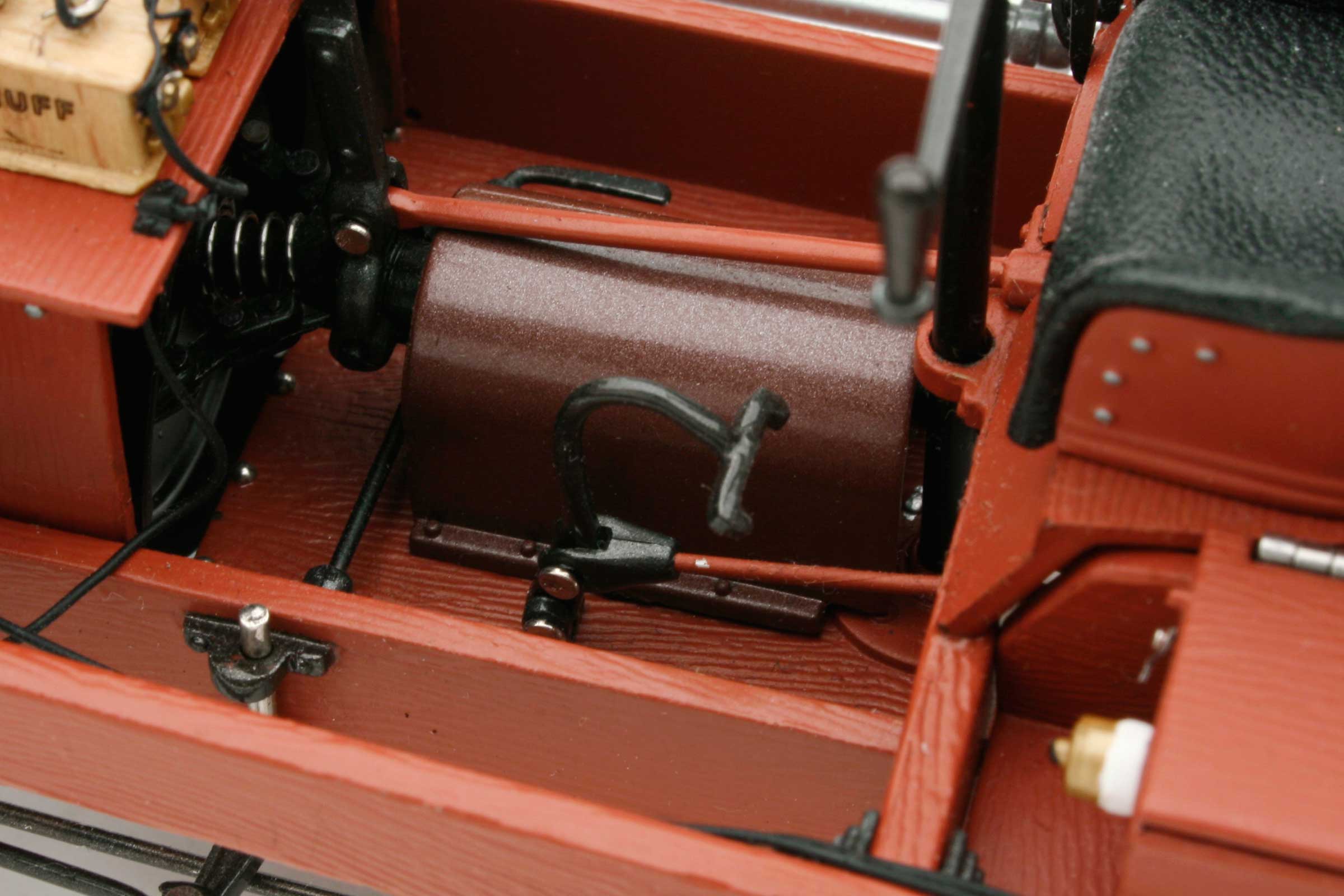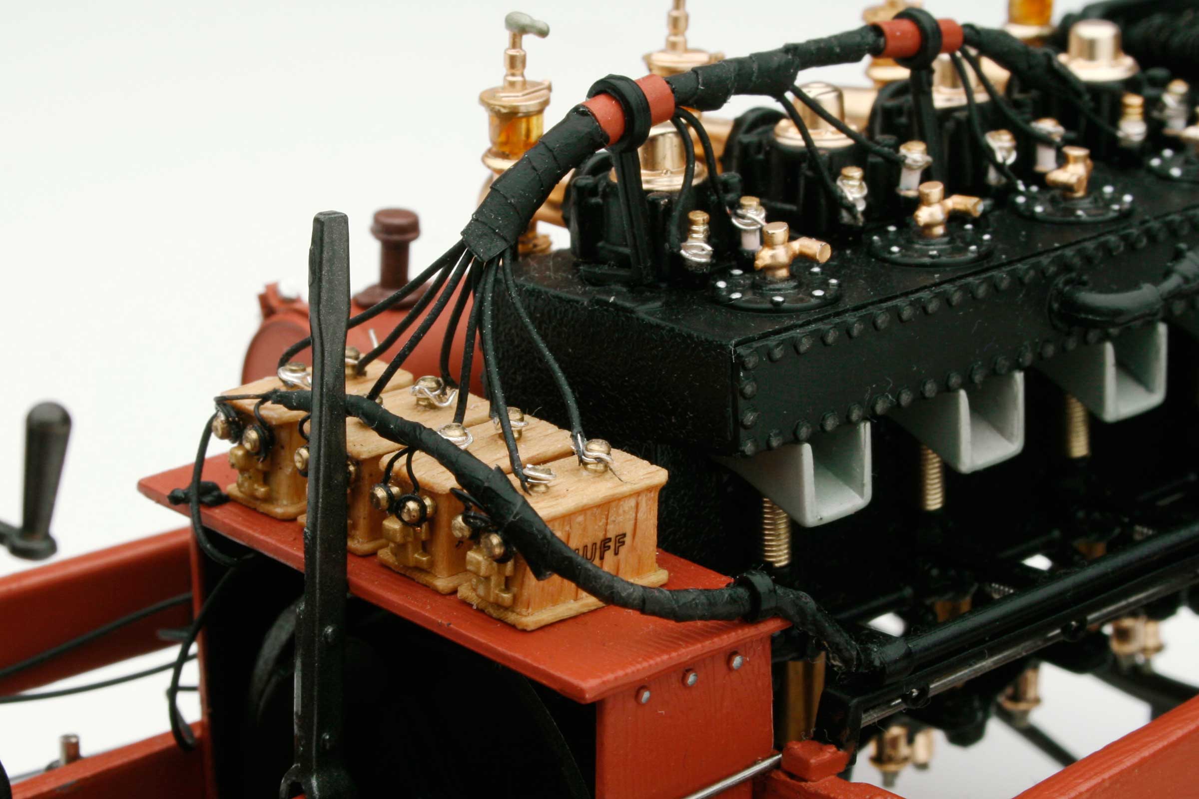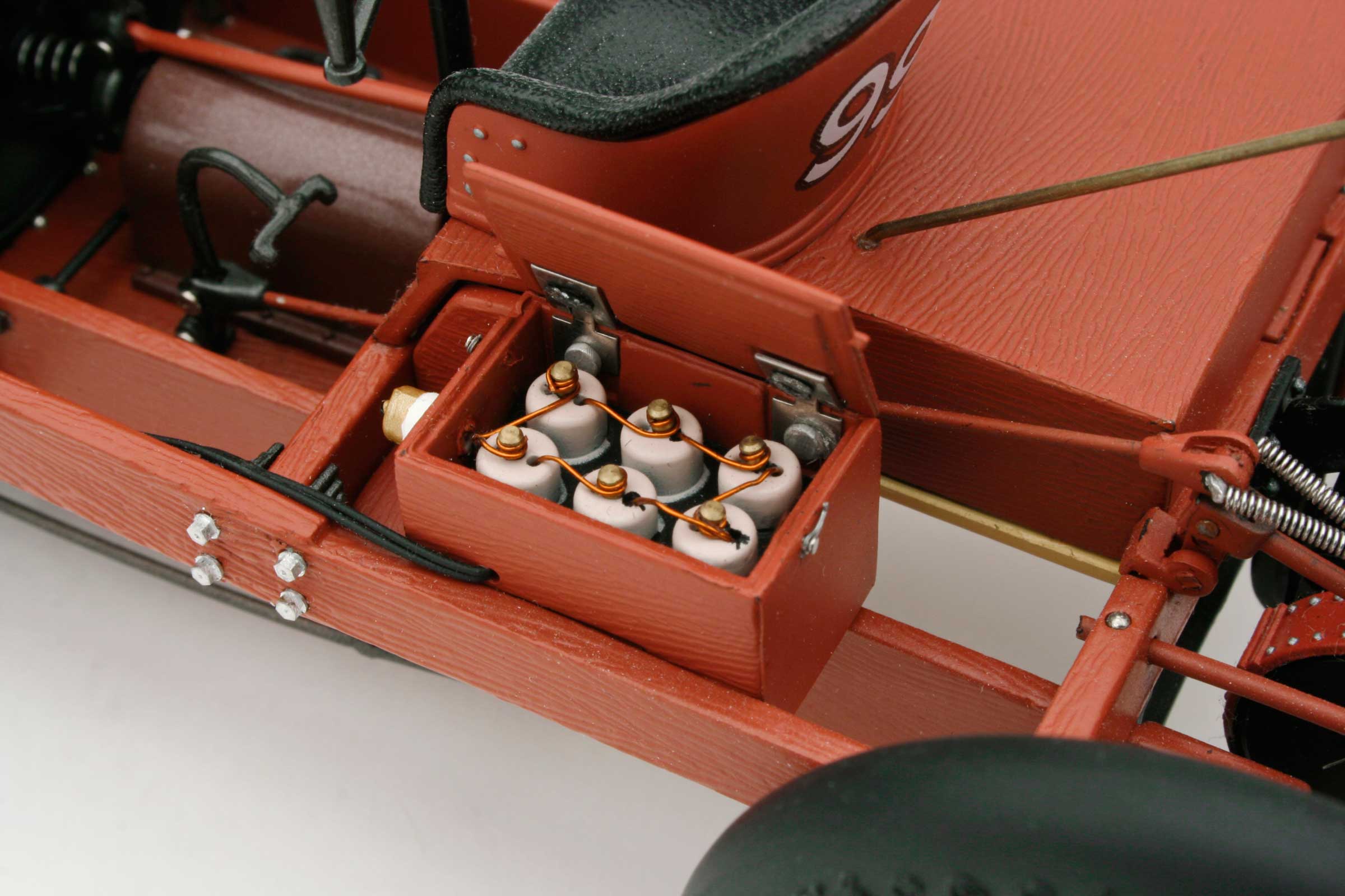 Some of the other special features include a radiator created from over 650 pressed brass fittings threaded onto the cooling tubes, machine turned nuts and bolts, highly detailed engine, hand-wrapped wiring harnesses, wired beer can-type batteries in a locking box, and much, much more made from wood, wood veneer, zinc, brass and photo-etch metal.
