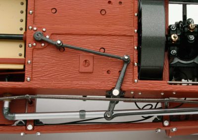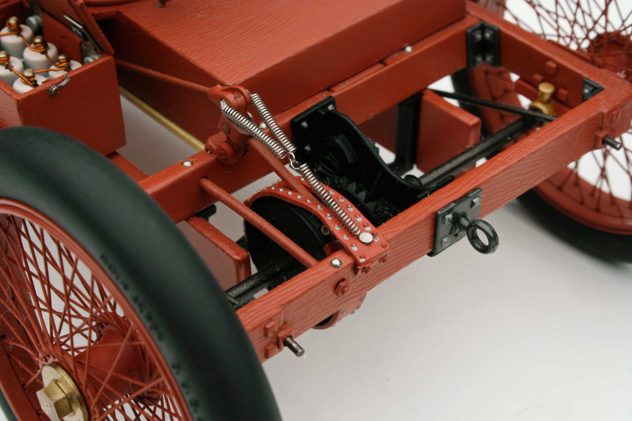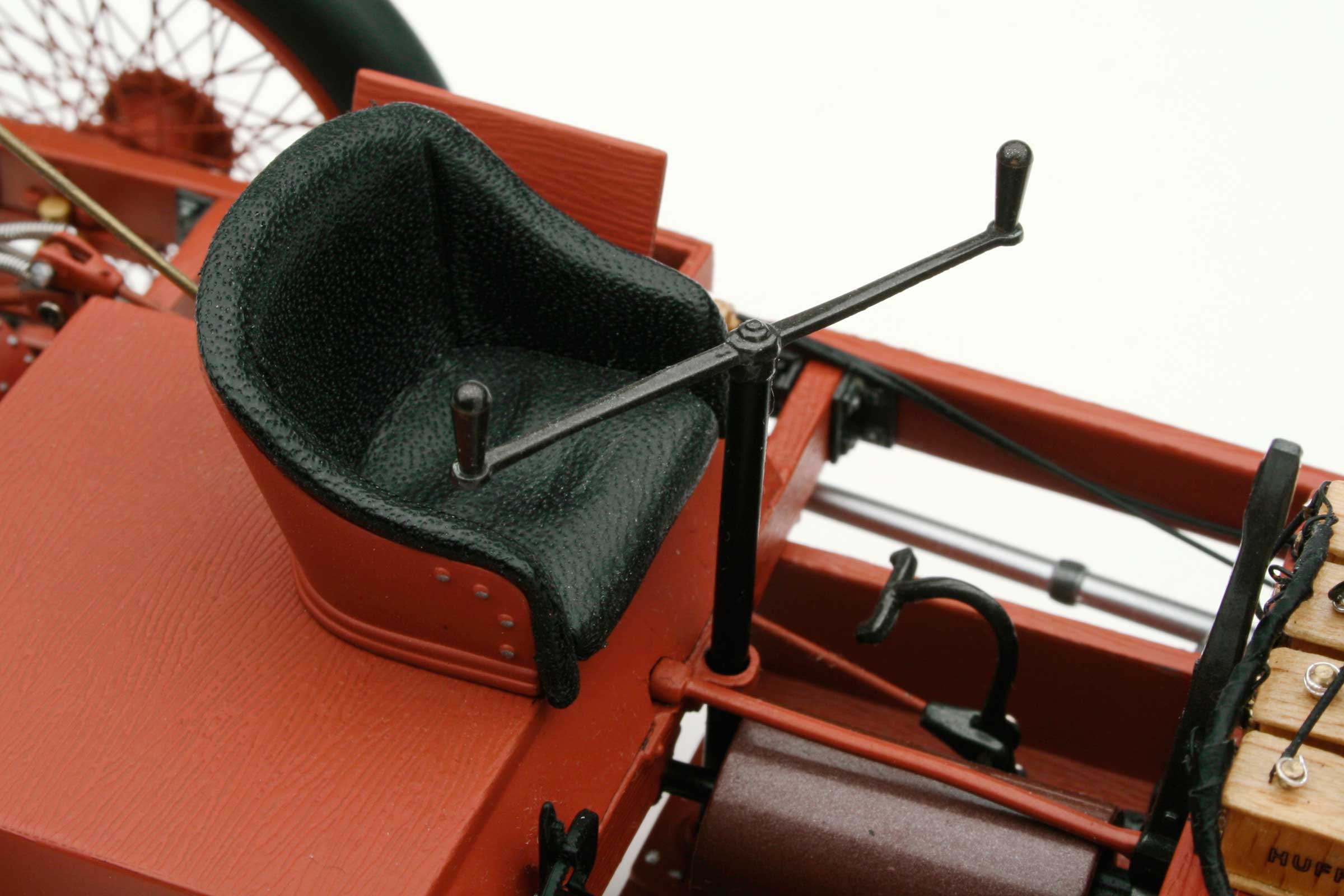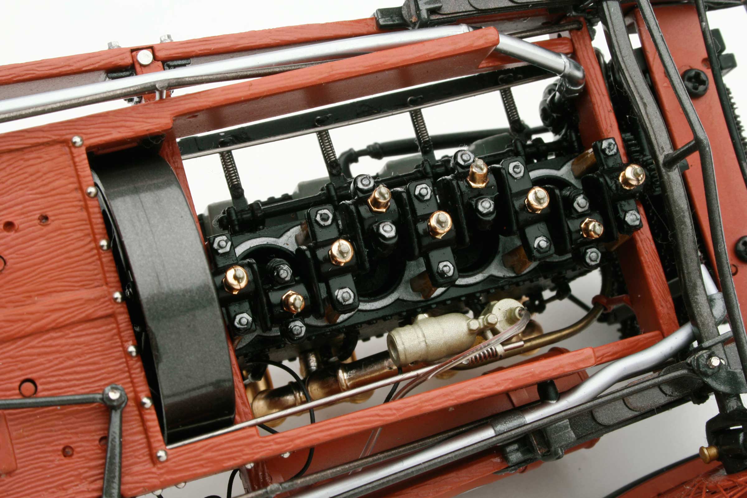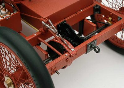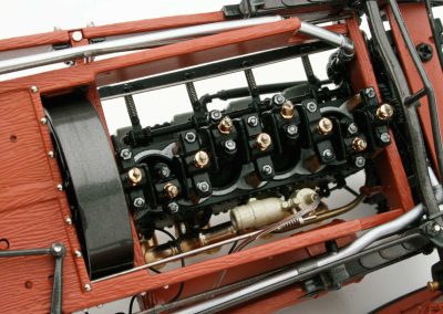 Engineering began with the inner workings of the 1,155.3c.i. (18.9 liter) four cylinder engine with its open-bottom lubricated by grease canisters! We sought to reproduce the exposed crankshaft and pistons in grand 1:18 scale. We connected everything together to make the most sophisticated replica we’ve ever produced: At one end of the crank we attached the flywheel, a driveshaft that meets the rear axle at a working crown wheel and pinion, driving lovingly hand-laced genuine brass wire wheels. Driven off the front of the engine are fuel and water pump gears!