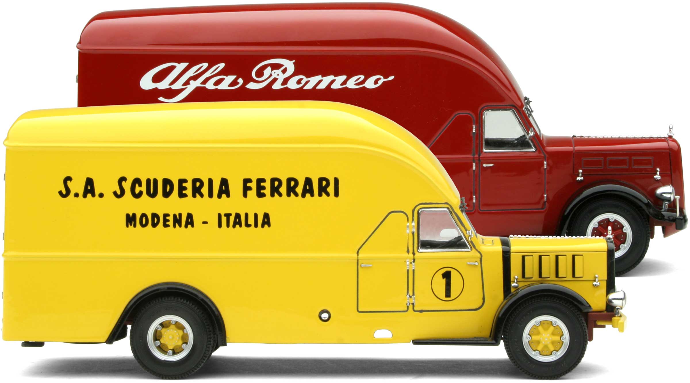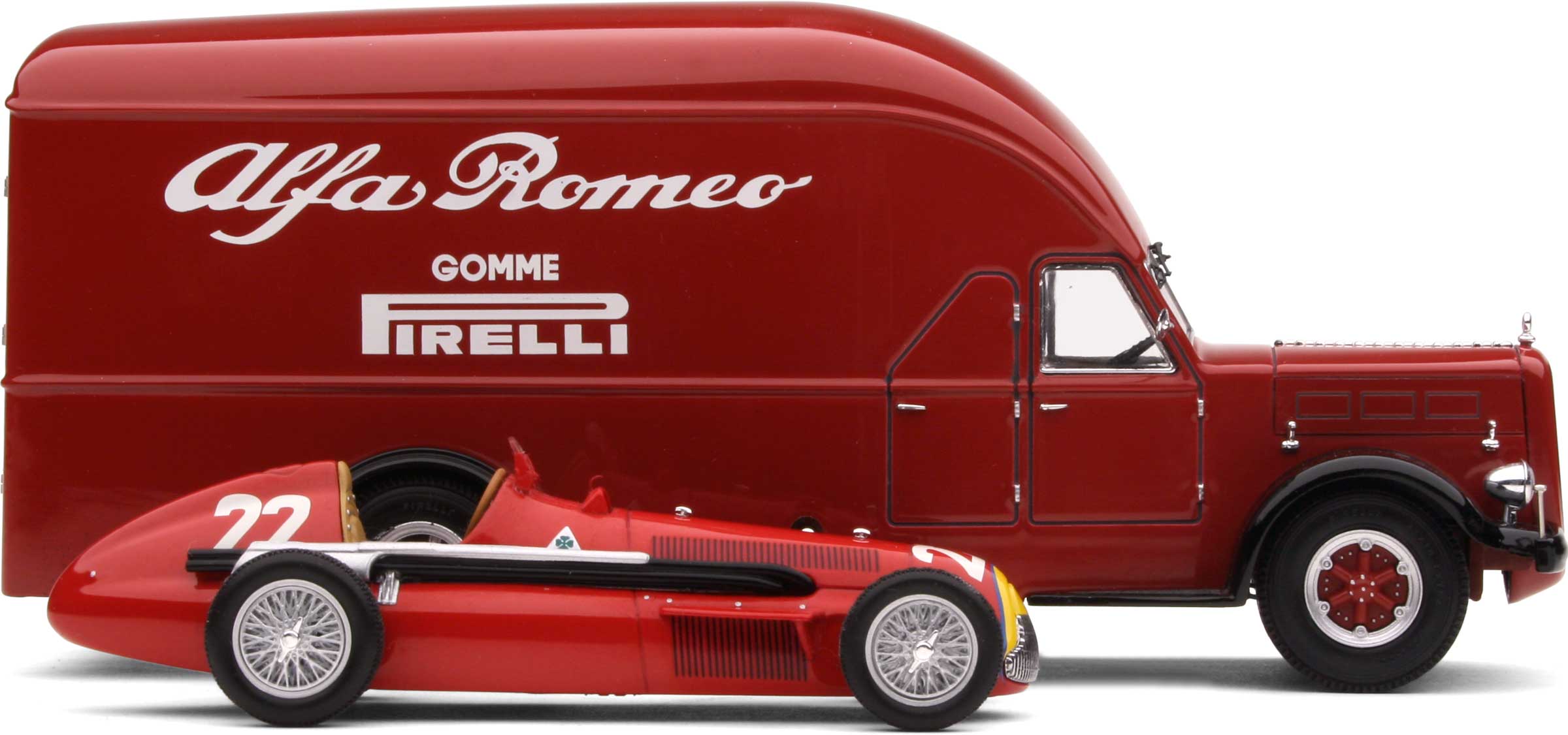 Exoto43 blows the competition away with remarkable 1:43 scale details. Exoto has even managed to engineer nostalgia into our 1:43 scale miniature Alfa Romeo 500 Racing Car Transporters! Our proven ability to reproduce minute details in 1:18 scale has been translated into precision on an even smaller scale. Tight seems, precise casts, genuine photo-etch metal details, and high grade materials set Exoto43 replicas apart! The rear doors, featuring a lock operated by a miniature chromed handle, is sure to bring a smile to any collector’s face. Rolling wheels and positionable loading ramps allow the Alfa Romeo 500 to be positioned for loading.