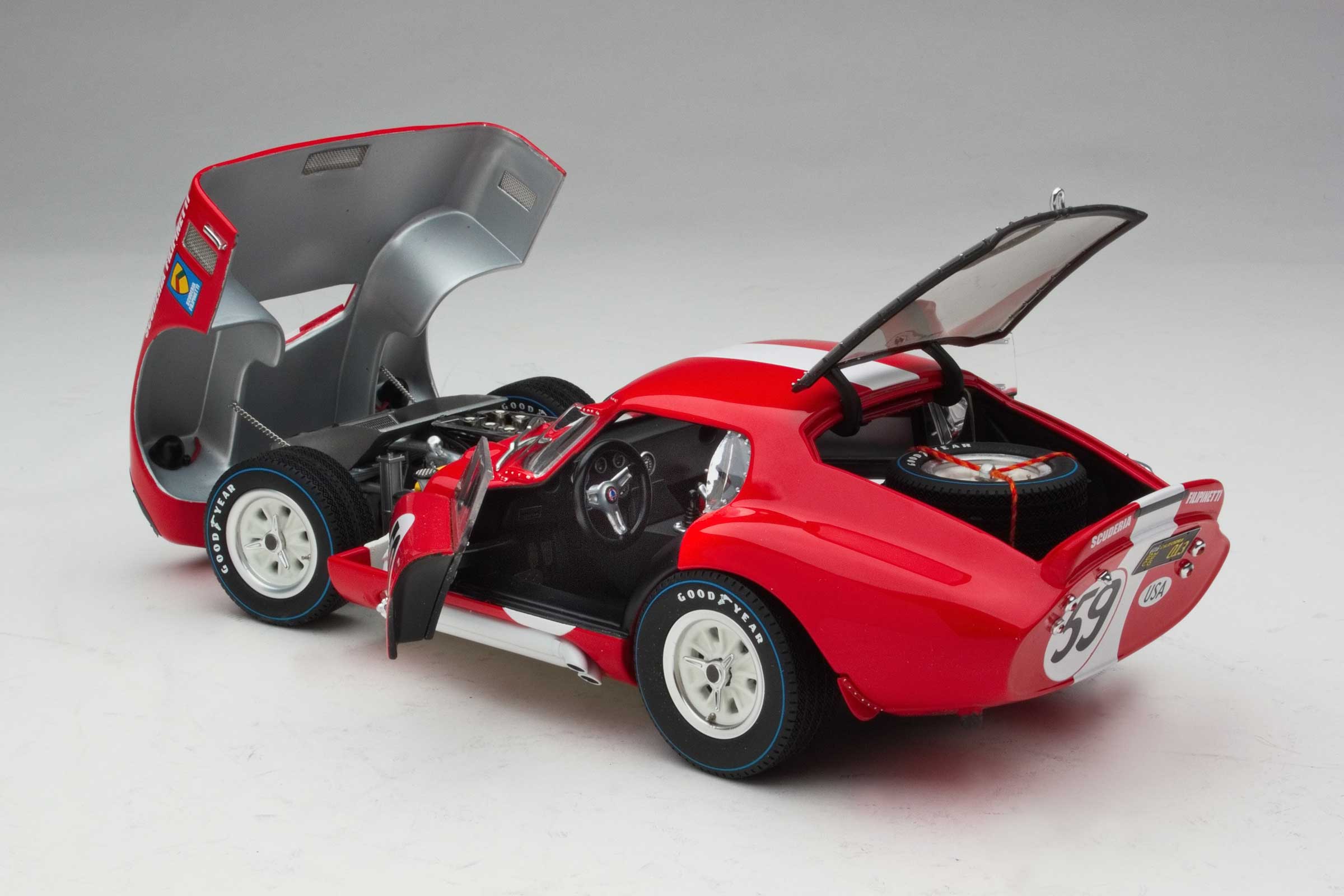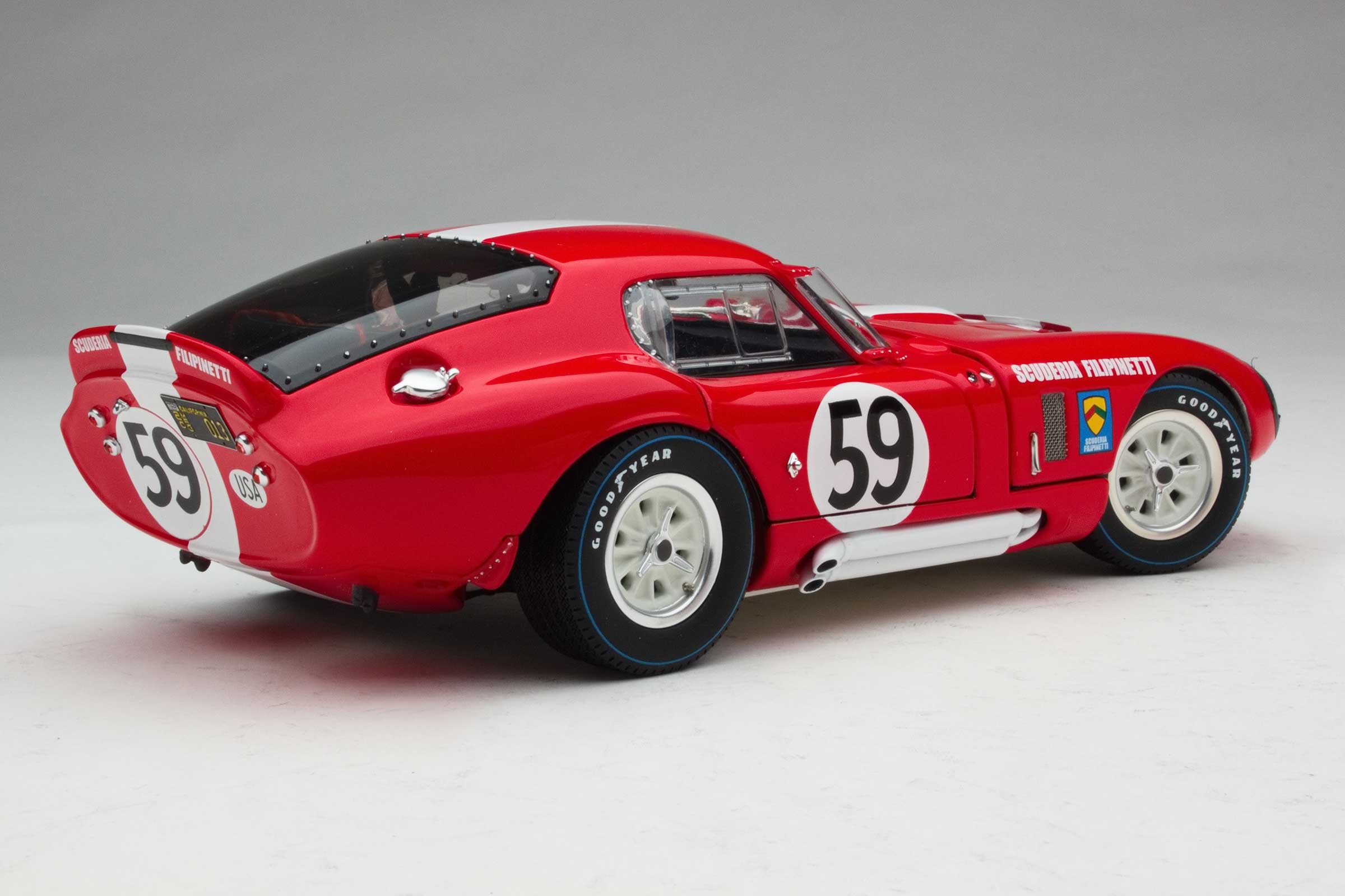 A beautiful reproduction of chassis CSX 2602, item #RLG18004, which had the distinction of being the only Cobra Daytona Coupe to have ever raced in the national red and white colors of Switzerland. This attractive color combination was the well known livery of the famous Swiss racing team, the Scuderia Filipinetti. The latter had already carved a reputation for themselves with their very well prepared, and successfully raced, Ferrari entries. So when Ford used up their allotment of entries for the 1965 Le Mans race, they prevailed on Georges Filipinetti (owner of the team), to buy one of his annual entries. Hence the unusual color scheme.