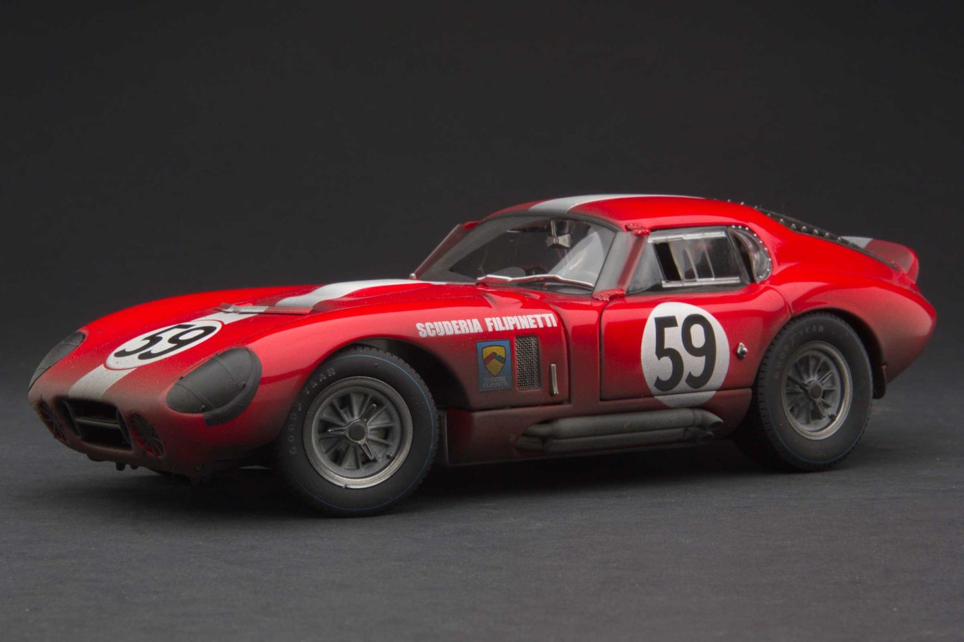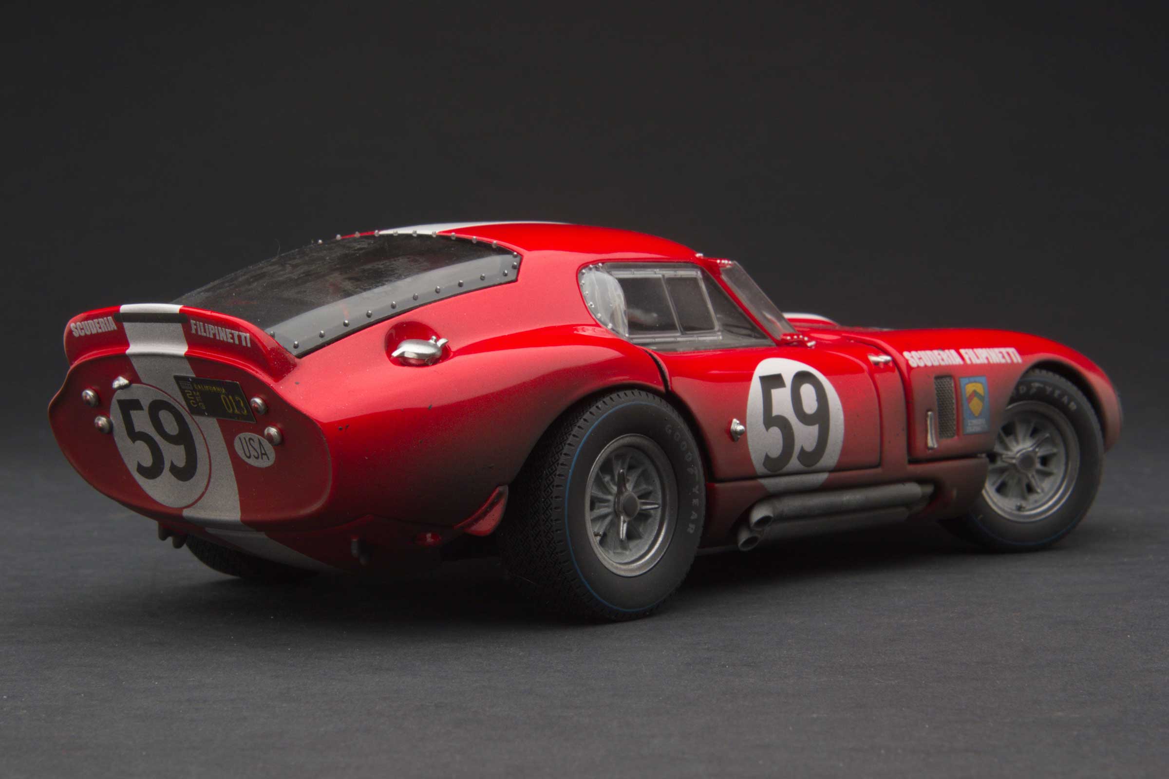 A beautiful reproduction of chassis CSX 2602, item #RLG18004, which had the distinction of being the only Cobra Daytona Coupe to have ever raced in the national red and white colors of Switzerland. This attractive color combination was the well known livery of the famous Swiss racing team, the Scuderia Filipinetti. The latter had already carved a reputation for themselves with their very well prepared, and successfully raced, Ferrari entries. So when Ford used up their allotment of entries for the 1965 Le Mans race, they prevailed on Georges Filipinetti (owner of the team), to buy one of his annual entries. Hence the unusual color scheme.