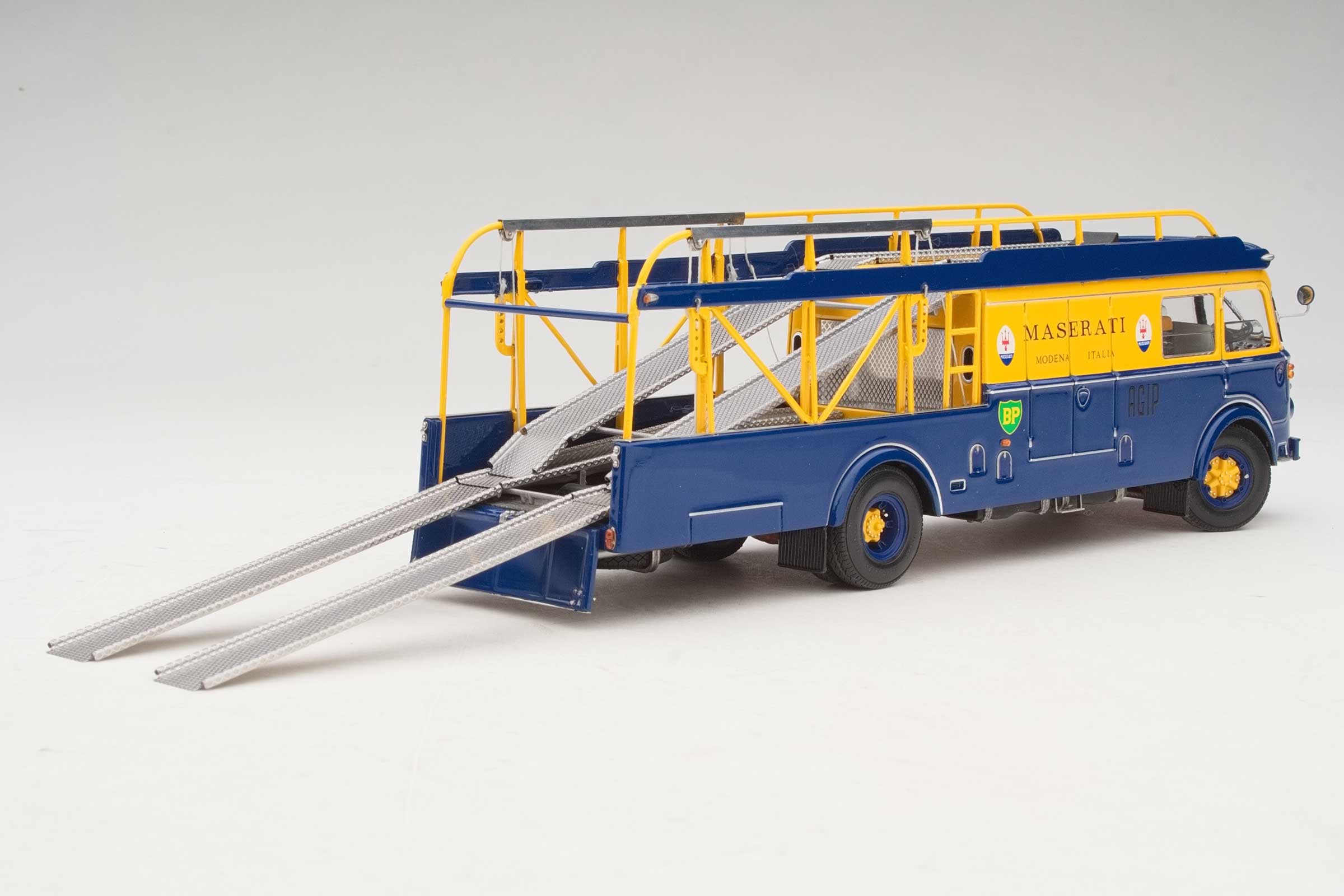 The Fiat Bartoletti 642 was a masterpiece of practical Italian design, built on Fiat’s reliable 642 RN2 chassis and bodied by Bartoletti to carry multiple racing cars in a two-deck configuration. With its partially enclosed bodywork, loading ramps, and storage for spares and tools, the transporter was as much a workshop on wheels as it was a hauler. Painted in Maserati’s deep blue with bold yellow panels, it presented an image of professionalism and pride befitting the Modenese marque.