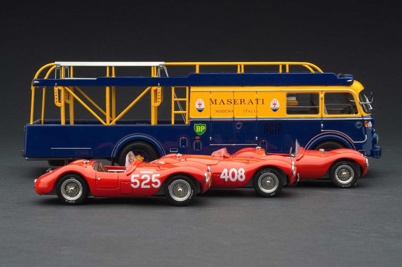 Throughout the 1950s, the Bartoletti 642 was instrumental in Maserati’s sports car racing campaigns, transporting A6 GCS cars to events across Italy and beyond. At the 1953 Mille Miglia, the A6 GCS #525, driven by Giletti and factory mechanic Guerino Bertocchi, benefitted from the transporter’s mobile support, allowing it to tackle the grueling thousand-mile endurance course with preparation and precision. Two years later, the A6 GCS #408 made its mark at the 1955 Giro di Sicilia with Maria Teresa de Filippis behind the wheel, one of the few women competing at this level in the era, demonstrating Maserati’s willingness to support both male and female drivers in top-tier events. Beyond these highlights, the A6 GCS also saw success at the Targa Florio and Coppa Inter-Europa, often securing class victories and high finishes thanks to the careful preparation made possible by the Bartoletti 642.
