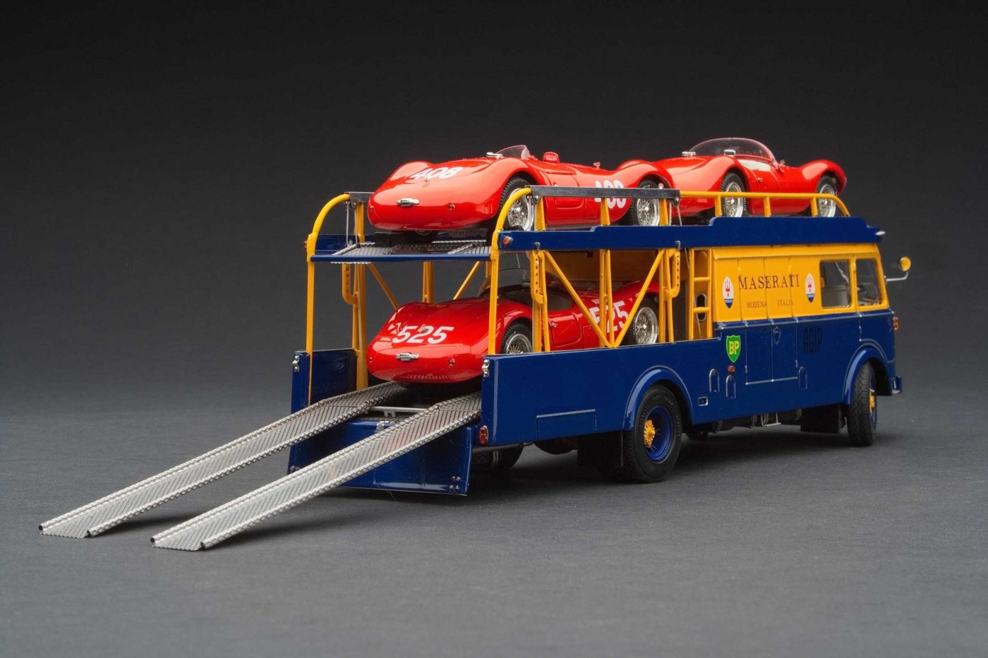 The Fiat Bartoletti 642 was a striking combination of utility and Italian style, built on Fiat’s 642 RN2 chassis and bodied by Bartoletti to carry multiple race cars in a two-deck layout, ramps, integrated storage for tools and spare parts, and an enclosed cab for long journeys across Europe. Finished in Maserati blue and yellow, the truck projected the marque’s elegance and professionalism wherever it appeared.