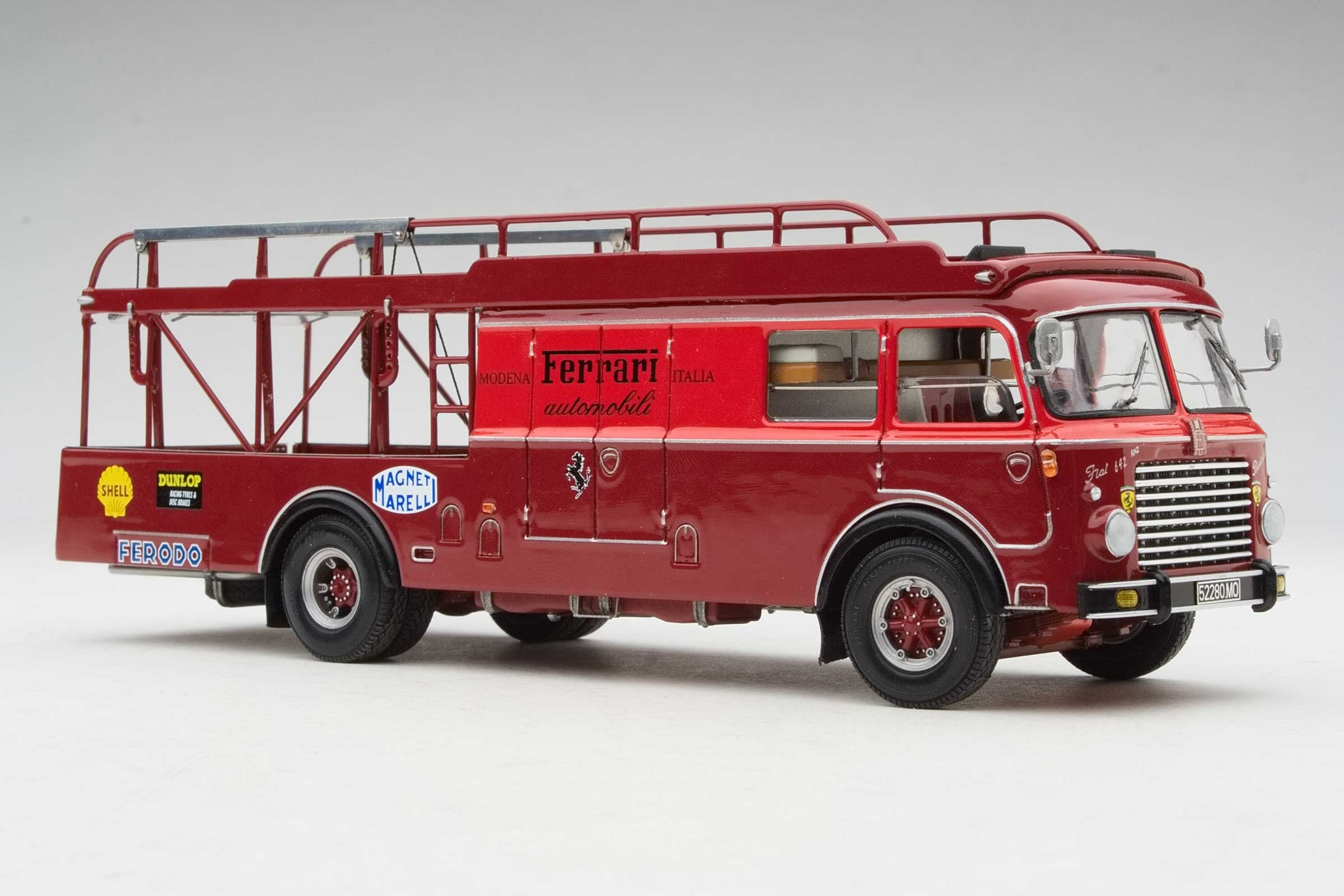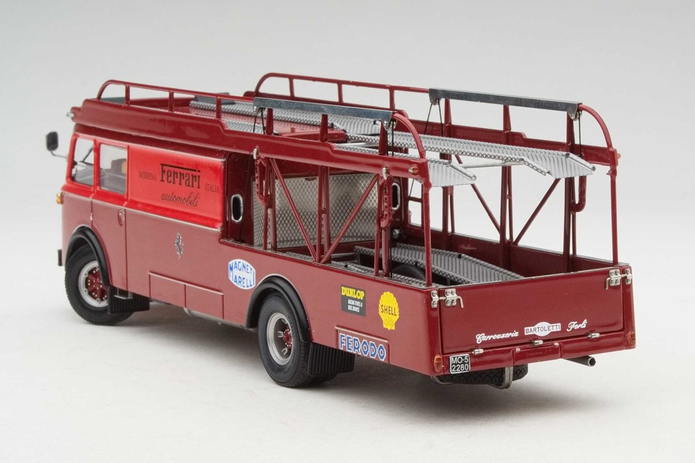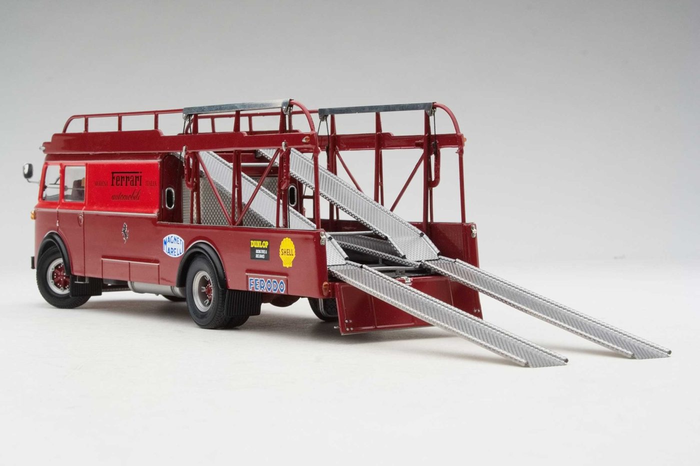 The Scuderia Ferrari Bartoletti 642 was the backbone of Ferrari’s sports car racing operations in the mid-to-late 1950s. First pressed into service in 1956, it could be found at events such as the Monza Supercortemaggiore race, where Ferrari fielded its new 500 TRs and TRCs, and at the grueling Targa Florio that same year. In 1957 the transporter was loaded with works entries for both the Mille Miglia and Le Mans, and it returned to La Sarthe in 1958, carrying the Testa Rossas that would define an era. Its distinctive multi-level deck and bold Ferrari red paint made it instantly recognizable in the paddock, as much a part of the spectacle as the cars it carried.