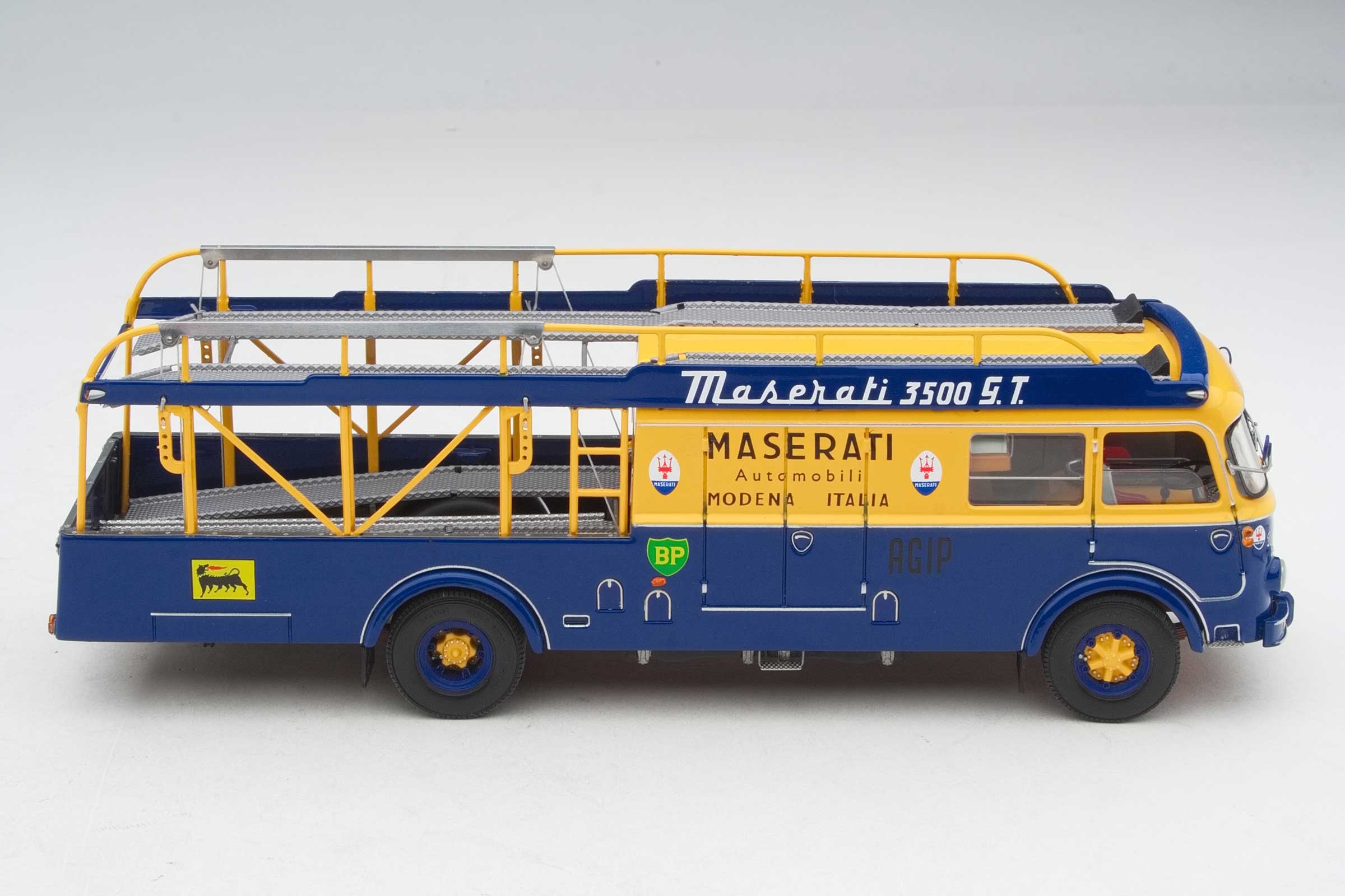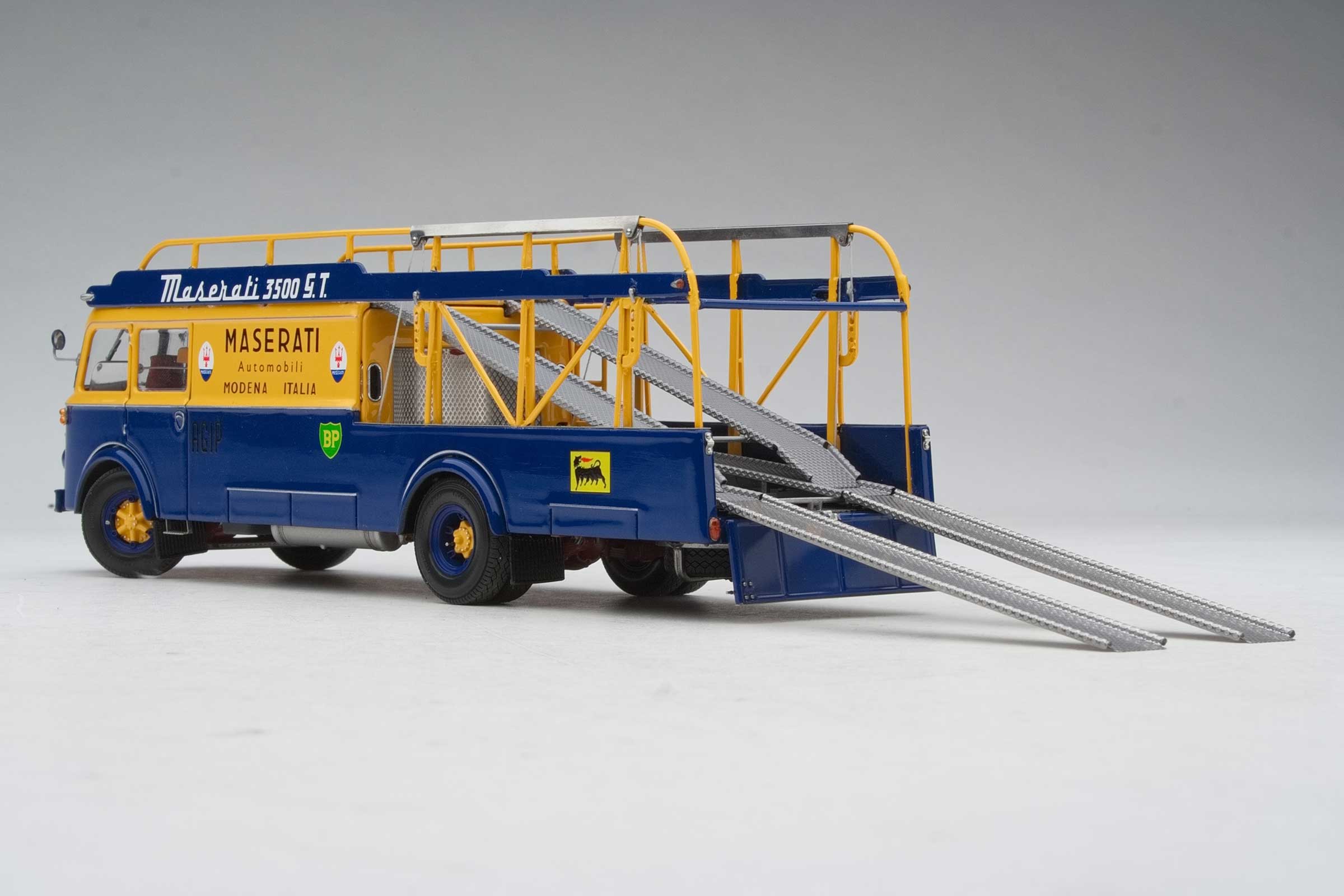 The Fiat Bartoletti 642 RN2 built for Maserati embodied the fusion of rugged utility and Italian elegance. Bartoletti’s custom bodywork allowed up to three cars to be stacked within its two-deck layout, while tool lockers, ramps, and enclosed sides ensured the team’s parts and equipment were well protected on long journeys across Europe. Painted in Maserati blue and yellow, the transporter doubled as both a functional hauler and a rolling showcase for the prestige of the Trident.